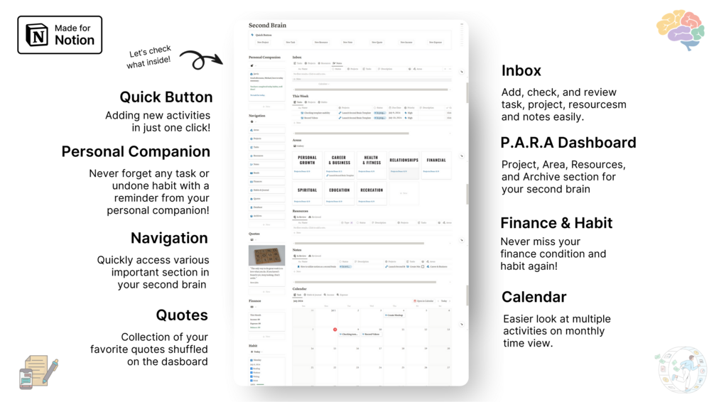 Embark on your journey of unparalleled productivity with your ultimate second brain companion! Designed to optimize your personal and professional life, this template helps you manage tasks, habits, projects, and more with ease. Whether you're aiming to enhance your knowledge management or achieve balance across various life areas, this template is your blueprint for success. Ready to transform the way you organize your life? Start mastering your mind today!