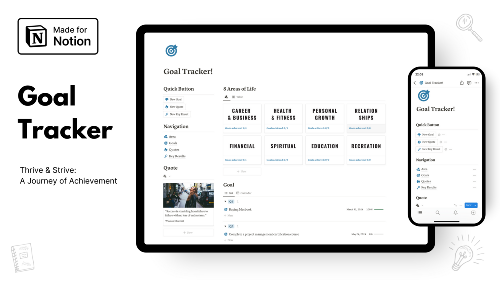 Embark on your journey of achievement with Thrive & Strive, your personalized goal tracking companion! Designed to streamline your path to success, this template empowers you to set, monitor, and conquer your aspirations with ease. Whether you're striving for professional growth, personal development, or both, Thrive & Strive is your roadmap to realizing your dreams. Ready to embark on your journey of achievement? Start thriving with Thrive & Strive today!