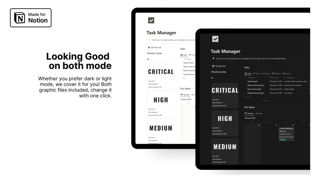 Notion templates are pre-built layouts which can be integrated directly into your Notion workspace. The Task Manager is built inside Notion and is easy to use and set up even with no prior knowledge. Video tutorial also included in the template if you need help.