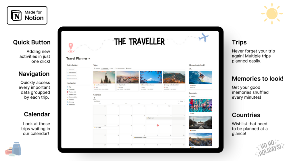 This Travel Planner is for anyone with a passion for exploring new places. Whether you're a seasoned traveler or planning your first adventure, this template is your go-to tool for an organized and unforgettable journey. -